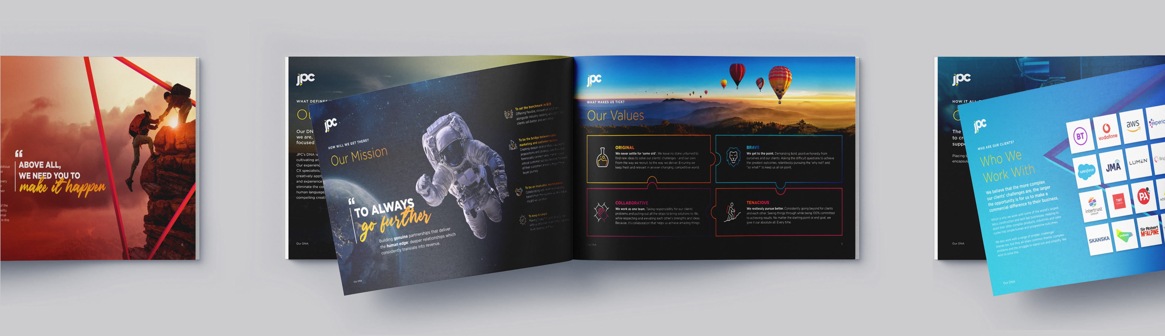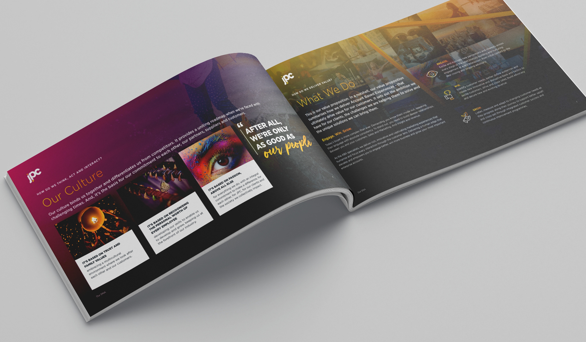 When I joined JPC, they had just finished undergoing a rebrand. I was tasked with designing a visually engaging brand DNA booklet that reflected our brand identity and core values.